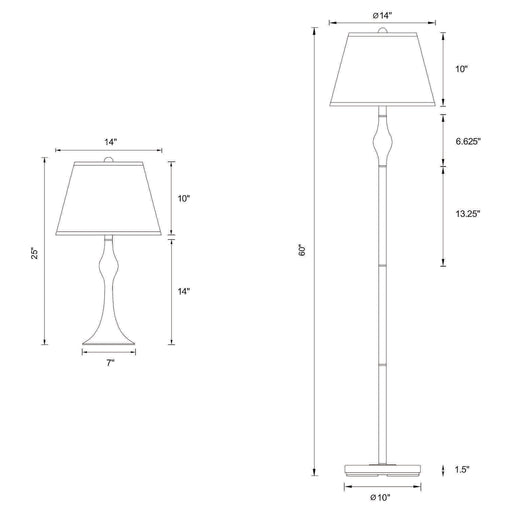 CoasterThis cohesive three-piece lamp set includes one floor lamp and two matching table lamps, each with elegant contoured stems and a soft brushed nicke...