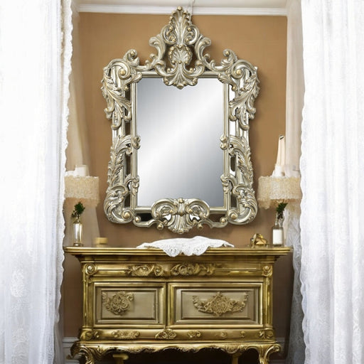 Acme Furniture IncA luxurious antique silver finish with hand-brushed gold accents makes up the Sandoval mirror. Surrounded by fine Rococo scrolls and floral ornamen...