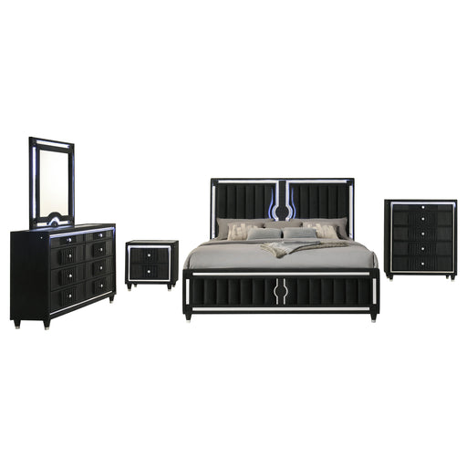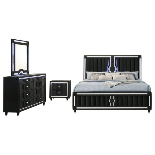 CoasterBedroom set dresses the room like a black tuxedo, combining black polyester velvet, bold vertical channels, and blue LED touch lighting for a moder...
