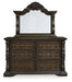 | Details | B947B8: Includes upholstered poster headboard panel, poster footboard panel, rails, slats, posts and canopy , Made with hardwood solids, oak veneer, MDF substrates and cast resin components, Dark brown finish, Metal canopy, Foam headboard cushion with polyester upholstery, Measure room, including ceiling height, to ensure bed clears fans and light fixtures, Foundation/box spring required, sold separately, Mattress available, sold separately, Assembly required, B947B1: Includes dresser and mirror, Made with hardwood solids, oak and ash swirl veneers, MDF substrates and cast resin components, Dark brown finish, 6 smooth-gliding drawers with dovetail construction (top drawer felt lined), Drawer pulls with antiqued goldtone finish, Mirror attaches to back of dresser, | |