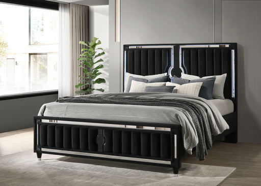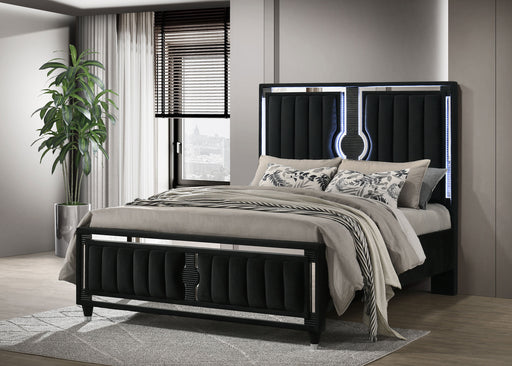 CoasterLED panel bed channels the confidence of a black tuxedo, pairing black polyester velvet with bold vertical channels and cool blue touch lighting. R...