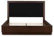 Casual contemporary styling with a decidedly modern vibe. Bathed in a rich dark brown finish, this king upholstered panel bed is warm and inviting. Full wrap-around rails set to the floor adorn your restful retreat with on-trend elegance. A cozy upholstered headboard with layback comfort features USB charging to keep your electronics at the ready. What a simply stunning way to achieve the bedroom of your dreams.