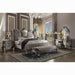 The Versailles collection harmonizes traditional details with functional design to accommodate today's styles. This bedroom collection features antique platinum veneers, nailhead trim accents, button tufted headboard/footboard , padded side rails, and hand-carved style wood drawer overlays throughout all case pieces. The ample storage case pieces, beveled mirror, Felt-Lined drawers, and antique platinum finish hardware make this set truly elegant and will be a great addition.