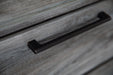 Details Made of engineered wood (MDF/particleboard) and decorative laminate, Smoky gray finish over replicated oak grain with authentic touch, Linear pulls with antiqued gunmetal-tone finish, 6 smooth-gliding drawers, Drawer interiors are lined with a faux linen laminate for a clean, finished look, Safety is a top priority, clothing storage units are designed to meet the most current standard for stability, ASTM F 2057 (ASTM International), Drawers extend out to accommodate maximum access to drawer interior while maintaining safety