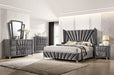 The ultimate Art Deco-inspired dresser! The elegance, glamour, unique shapes and vintage appeal of 1930's Hollywood is right here! The decadent gray velvet upholstery looks like it came right out of a classic old movie! There's a prestige with the unique design that seems to capture all of the excitement of a beloved bygone era! Additional embellishments such as rhombus chrome feet and diamond ring drawer-pulls faithfully enhance the cinematic reality.