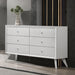 Minimalist and modern, the Cerys dresser offers sleek clean lines for a contemporary take. This dresser features six spacious drawers to help you keep a tidy bedroom. Sitting on stylish angled squared wooden tapered legs that provide a modern visual appeal. The white finish makes for the perfect blank canvas for any room.