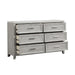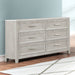 Crafted with precision, the Fiona 6 Drawer Dresser seamlessly combines the beauty of real wood with durability. Its construction features Acacia Solids, Manufactured Woods, and Oak Veneer, ensuring strength and stability. The multi-step finish, achieved through wire brushing and white glazing, enhances the natural wood grain, resulting in a light, clear mist gray finish. The dresser’s design showcases sophisticated details, including picture frame moldings, tapered legs, and sleek drawer pulls. On top, a genuine white and gray marble surface adds a rich accent that complements the wood finish. Whether your decor leans traditional or contemporary, the transitional style of the Fiona dresser effortlessly fits in. Practicality meets elegance with time-tested drawer construction. French front and English back dovetail joinery ensures strength, while full-extension glides allow smooth operation. Thoughtful extras include sanded and sealed drawers to prevent clothing snags, and a felt-lined top drawer to protect delicate items.