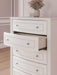 Details Made with engineered wood (MDF/particleboard/plywood) and decorative laminate for the right balance of affordability and durability, Matte white finish, Decorative laminate replicates natural or man-made material surfaces with consistent color, pattern and texture, Crystal drawer knobs, 5 smooth-gliding drawers, Drawer interiors are lined with a faux linen laminate for a clean, finished look, Safety is a top priority, clothing storage units are designed to meet the most current standards for stability, ATM F 2057 (ASTM International), Drawers extend out to accommodate maximum access to drawer interior while maintaining safety, Minor assembly required