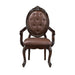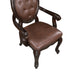 The Royal Classics Palazzo Marina Dining Arm Chairs, set of 2 in Walnut, offers a perfect fusion of enduring craftsmanship and timeless sophistication. Constructed from solid Poplar with Cherry veneers, these armchairs are built to last while maintaining their elegant appeal. The meticulous multi-step finish enhances the natural beauty of the wood, bringing out its rich grain, while the intricately carved details with burnished gold accents add a touch of luxury. The signature circular carving on the chair backs showcases the collection’s hallmark design. Upholstered in luxurious Chestnut brown vegan leather, the button-tufted backs and plush cushions provide exceptional comfort and regal charm, making these armchairs ideal for formal dining settings. Whether for everyday use or special occasions, these chairs add a refined and inviting presence to any dining space.