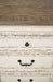 Details D743-45: Made of veneers, wood and engineered wood with some cast resin components, Antiqued two-tone finish, Separate extension leaf, Table extends by pulling both ends and dropping in leaf, Seats up to 8, Assembly required, D743-02: Made with wood and engineered wood, Distressed, chipped white finish, Stylized ribbon back design, Polyester upholstery over foam cushioned seat, Assembly required,