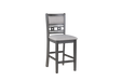 The stylish Gia 5 Piece Counter Dining Table and Chair set is built with comfort, durability and function in mind. This dining set provides spacious seating for four, with the added convenience of two storage shelves located under the table top, perfect for storing dinnerware or board games to pull out on game night. The counter table apron, table legs and dining chair legs are crafted of solid Rubberwood to add strength. The counter chairs gain added stability from 4 wood base stretchers that double as relaxing foot rests. The distinctive reverse diamond Mindi wood veneer dining table top accents the beautiful wood grains which are highlighted by the multi-step charcoal washed gray finish. The set includes four comfortable counter height chairs with 100% polyester natural upholstered seat cushions and backrests. The final touch is Gia's signature interlocking chain design on the chair back, giving this welcoming dining set a touch of sophistication. The result is a casual, contemporary dining set, perfect for your dining room or kitchen.