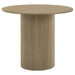 • Counter height dining table in natural oak features a 43-inch round top and fluted base