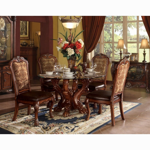 Acme Furniture IncThis beautiful dining table and chairs set boasts of round table with glass top and single pedestal base. Intricate carvings in table edges and cab...