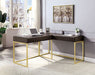 A wooden frame and metal base harmoniously blend to fit your space. The matte gold finish, with its simple shape and dainty silhouette is in striking contrast with the darker tones of the frame. Front panels are adorned with patterns that conceal the drawer, which open smoothly on ball-bearing glides. To further expand the piece, the right side desk has a lift-top mechanism that allows any health-conscious worker at home unparalleled productivity.