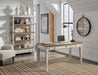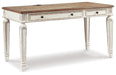 Elevating the art of traditional cottage styling, the Realyn desk and bookcase set is your heavenly home office realized. An antiqued two-tone aesthetic blends chipped white with a distressed wood tone for added charm. Framed drawer fronts, decorative corbels and elegantly turned and tapered legs add refinement, while dark bronze-tone knobs lend a classic touch. The desk's clever balance of shelf and drawer space beautifully works.