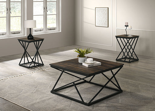 Furniture Of AmericaSpecifications Dimensions COFFEE TABLE: 31.5"W X 30.5"D X 18"H, END TABLE: 15.5"W X 15"D X 23"H Feat1 Rustic Feat2 Dark Brown/Black Feat3 Pa...