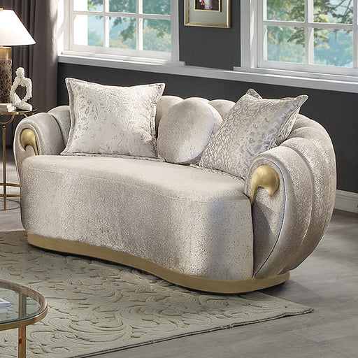 Furniture Of AmericaSpecifications Dimensions 67.5"W X 36"D X 32"H (SEAT HT: 19", SEAT DP: 26") Feat1 Glam Feat2 Beige/Gold Feat3 Solid Wood, Fabric, Stainless ...
