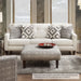 The neutral color palette not only enhances the contemporary feel of this set, but it also effectively brings out the darker tones of the accent chair and pillow patterns. Gray provides great contrast against the clean, ivory fabric of the sofa and love seat. Accent pillows and the matching chairs have two distinct but complementary patterns, while the removable cushions are firm and comfortable.