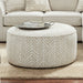 It's everything an Ottoman should be - broad, round, firm and soft - perfect for use in any room. The two-tone artful array of arrowhead / feather-like imprints boasts a pleasant contrast. Singular cord welt trim circles the buoyant and comfortable surface, a favorite for casual sitting or leg-resting. Easy portability satisfies a variety of demands and uses.