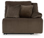 Experience unparalleled comfort with this reclining sectional with chaise. It’s a stylish and invitingly soft look—made all the more appealing by cozy corduroy cushions that feel great and add a touch of texture. The rich chocolate brown upholstery effortlessly blends into your decor, making it a gorgeous addition to your home. So sit back and unwind in this spacious set, perfect for gatherings with friends and family.
