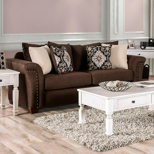 Furniture Of AmericaEnjoy a wonderful, relaxing day on this transitional-style American-built sofa! Dark wooden legs support the piece, while the individual nailheads ...