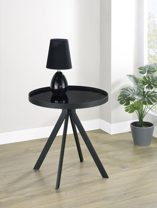 CoasterThis modern round end table combines durability and elegance with its tempered glass top featuring a marble-patterned print. Supported by a sturdy ...