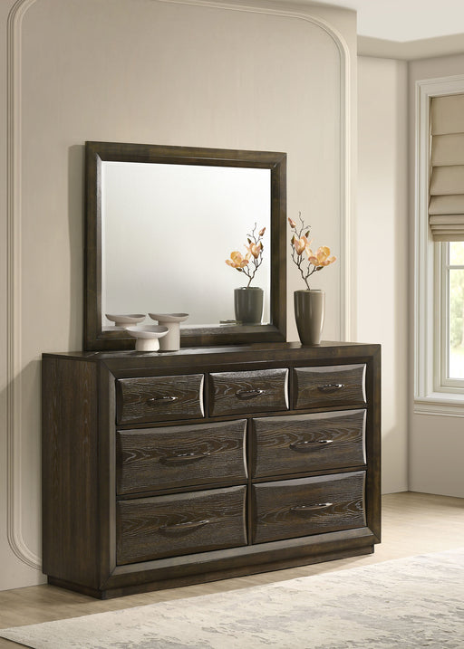 CoasterDresser and mirror set centers the bedroom with a framed mirrored surface reflecting light above sculpted storage. Seven drawers show bevelled arch...