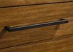 Dresser with eight drawers and stout posts brings modern rustic order to the bedroom. A warm wood tone highlights the grain across clean drawer fronts, finished with antique brass bar pulls for understated contrast. Built from rubberwood, engineered wood, and veneer, storage is supported by five-sided solid wood drawer boxes with English dovetail joinery and smooth heavy-duty drawer glides. Felt-lined top drawers protect smaller items, making this dresser an easy anchor for daily routines from socks to accessories.