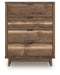 Nostalgic style, retooled for today’s trends. This chest of drawers puts an elevated twist on mod aesthetics. Its warm brown tones reflect the mid-century vibes you love, while the angular base incorporates contemporary motifs. Integrated drawer handles round out the look in sleek style. With this chest, you can build your bedroom into a modern haven with a touch of retro-cool flair.