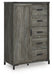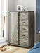 Details Made with engineered wood (MDF/particleboard/plywood) and decorative laminate for the right balance of affordability and durability, Rustic warm gray finish over replicated oak grain with authentic touch, Decorative laminate replicates natural or man-made material surfaces with consistent color, pattern and texture, Matte black drawer handles, 5 smooth-gliding drawers, 4 shelves behind hinged cabinet, Safety is a top priority, clothing storage units are designed to meet the most current standard for stability, ASTM F 2057 (ASTM International), Drawers extend out to accommodate maximum access to drawer interior while maintaining safety, Minor assembly required