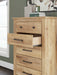 Details Made with engineered wood (MDF/particleboard/plywood) and decorative laminate for the right balance of affordability and durability, Natural brown finish with white hang-up over replicated wood grain with authentic touch, Decorative laminate replicates natural or man-made material surfaces with consistent color, pattern and texture, Knobs with dark bronze-tone finish, 5 smooth-gliding drawers, Safety is a top priority, clothing storage units are designed to meet the most current standard for stability, ASTM F 2057 (ASTM International), Drawers extend out to accommodate maximum access to drawer interior while maintaining safety, Minor assembly required
