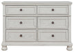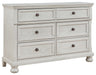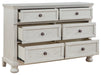Detalles Fabricado con madera, chapa de roble seleccionada y madera de ingeniería, acabado blanco envejecido con textura de grano, 6 cajones de deslizamiento suave con construcción de cola de milano y guías laterales de cojinetes de bolas de metal (cajones superiores con fondos de fieltro), perillas en tono bronce oscuro