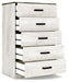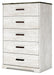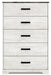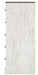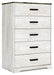 Detalles Fabricado con madera de ingeniería (MDF/tablero de partículas/madera contrachapada) y laminado decorativo para lograr el equilibrio adecuado entre asequibilidad y durabilidad, pintura desgastada replicada encalada, parte superior con veta de roble replicada en tablones grises rústicos con un toque auténtico, tiradores en tono peltre, 5 cajones de deslizamiento suave con lados y parte posterior envueltos en vinilo, la seguridad es una prioridad máxima, las unidades de almacenamiento de ropa están diseñadas para cumplir con el estándar más actual de estabilidad, ASTM F 2057 (ASTM International), los cajones se extienden para permitir el máximo acceso al interior del cajón manteniendo la seguridad, requiere ensamblaje