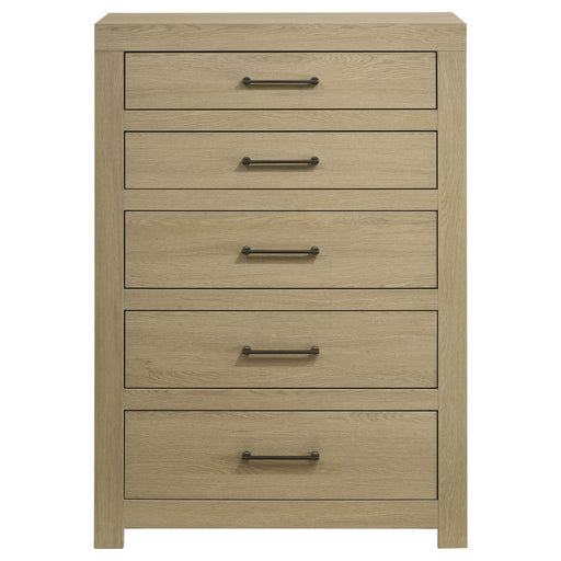CoasterChest of drawers with five drawers and stout posts brings vertical storage in a modern rustic profile. A warm wood tone highlights the grain across...