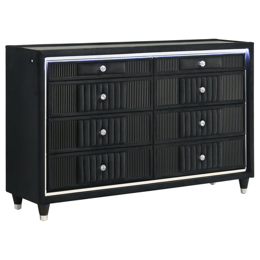 CoasterLED dresser cabinet brings modern art deco storage in black velvet, topped with recessed tempered glass for a smooth, easy-care surface. Blue LED t...