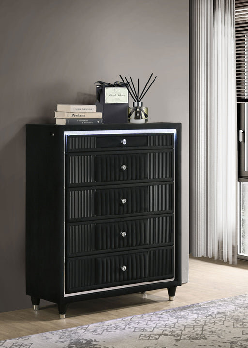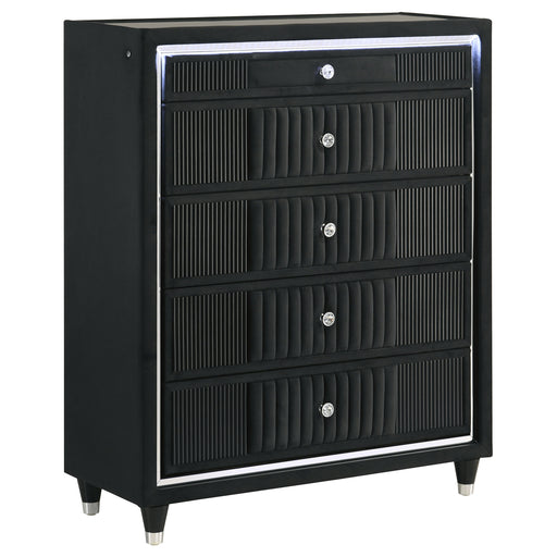 CoasterLED chest of drawers brings tuxedo-black vertical storage with velvet upholstery, recessed tempered glass, and blue LED touch lighting that adds a ...