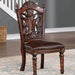 Bold and grand are some of the words that would describe this traditional dining set. The chair backs play host to two different treatments. This side chair has wooden backs with intricate carved details, while its front legs feature beautiful twisted rope carvings.