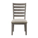The traditional styling of the Tigard Collection lends timeless appeal to the look of your casual dining space. With subtle hints nodding to the Arts and Crafts design movement, the ladder-back side chair features classic lines that solidify the versatile aesthetic of the collection. Covering the padded seats of the side chairs is a neutral tone fabric upholstery, complementing the traditional gray finish of the chair�s wood veneer.