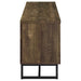 This rustic TV console offers a modern touch to a farmhouse style living room. A rustic oak finish showcases the classic herringbone pattern across the double cabinet doors. Supported on a metal trestle base in a gunmetal finish that offers an industrial flair, this TV console offers plenty of support while lifting the furniture piece over a rug and offering extra space beneath for baskets and organization. Inside each cabinet is a single adjustable shelf that may be lowered or raised as needed. In the center of this console are two open shelves for a gaming console and other entertainment systems.