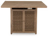 Un equilibrio perfecto entre diseño y utilidad, esta mesa de bar con fogón convierte cualquier espacio al aire libre en tu propio pedazo de paraíso. Elaborada con mimbre de resina de fácil cuidado sobre un marco de aluminio con apariencia de madera, es el epítome del estilo de ensueño californiano. Al presionar un botón se enciende una llama parpadeante que baila sobre un lecho de cuentas de vidrio. Y con espacio para hasta ocho personas, es una mesa muy cómoda.
