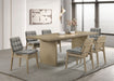 • Natural oak dining set pairs an 82-inch table with grey channel-tufted chairs