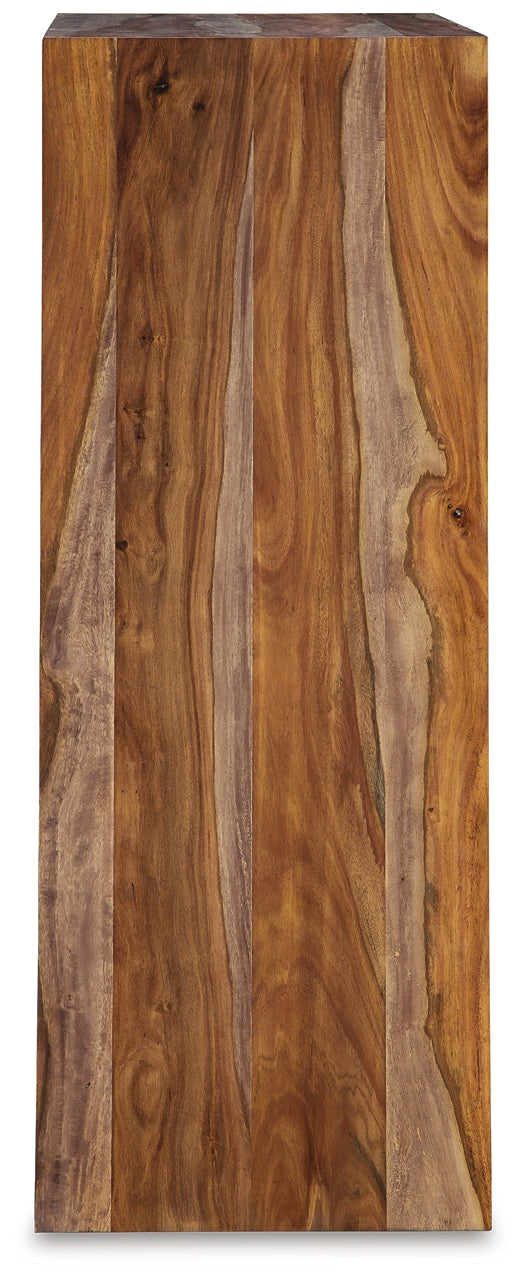 | Detalles | Fabricado con madera de sheesham, enchapado y sustrato de MDF, acabado en tono de madera natural transparente, marco frontal con borde biselado grueso, 5 cajones de deslizamiento suave con interior completamente terminado, construcción de cola de milano y guías laterales resistentes con cojinetes de bolas | |