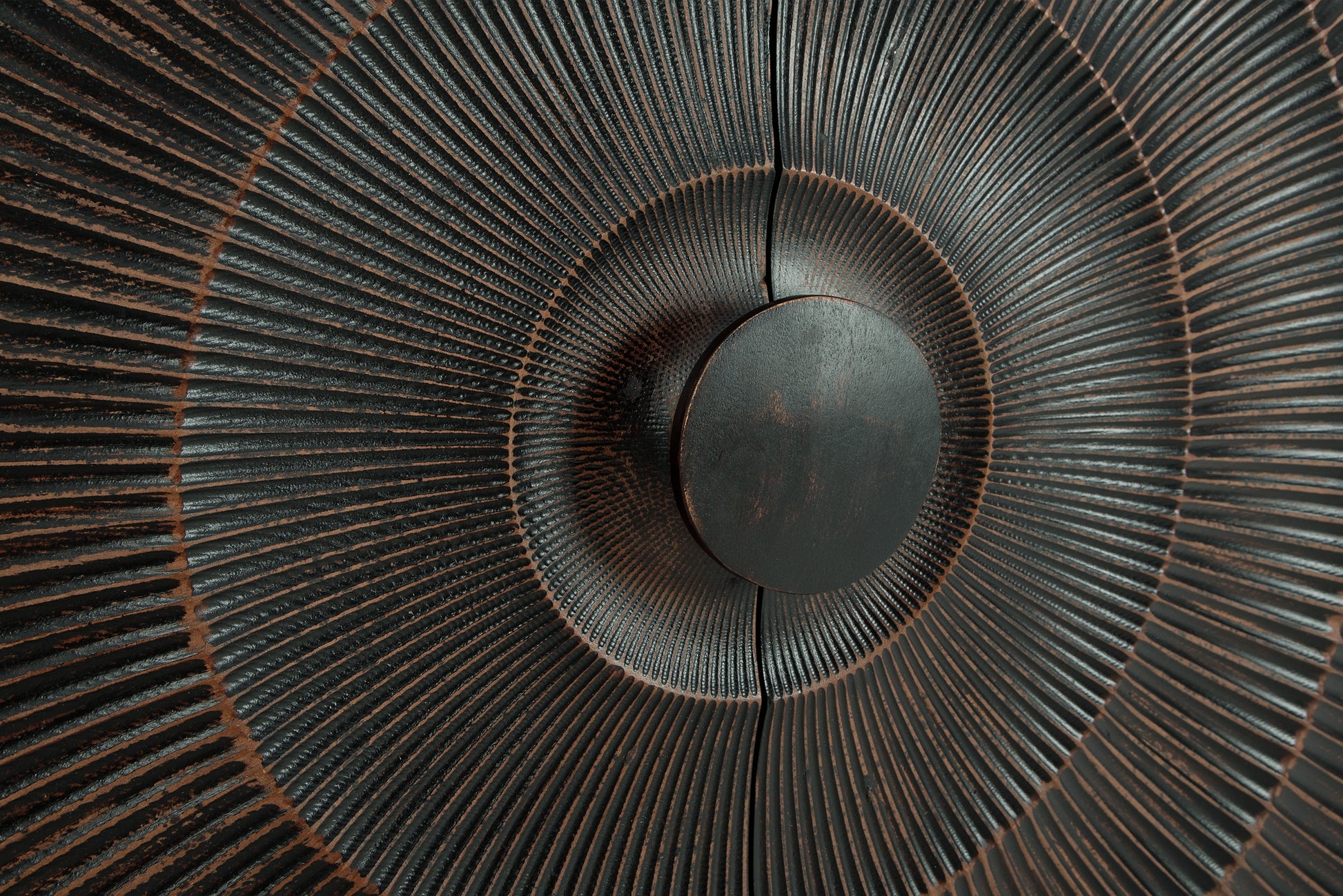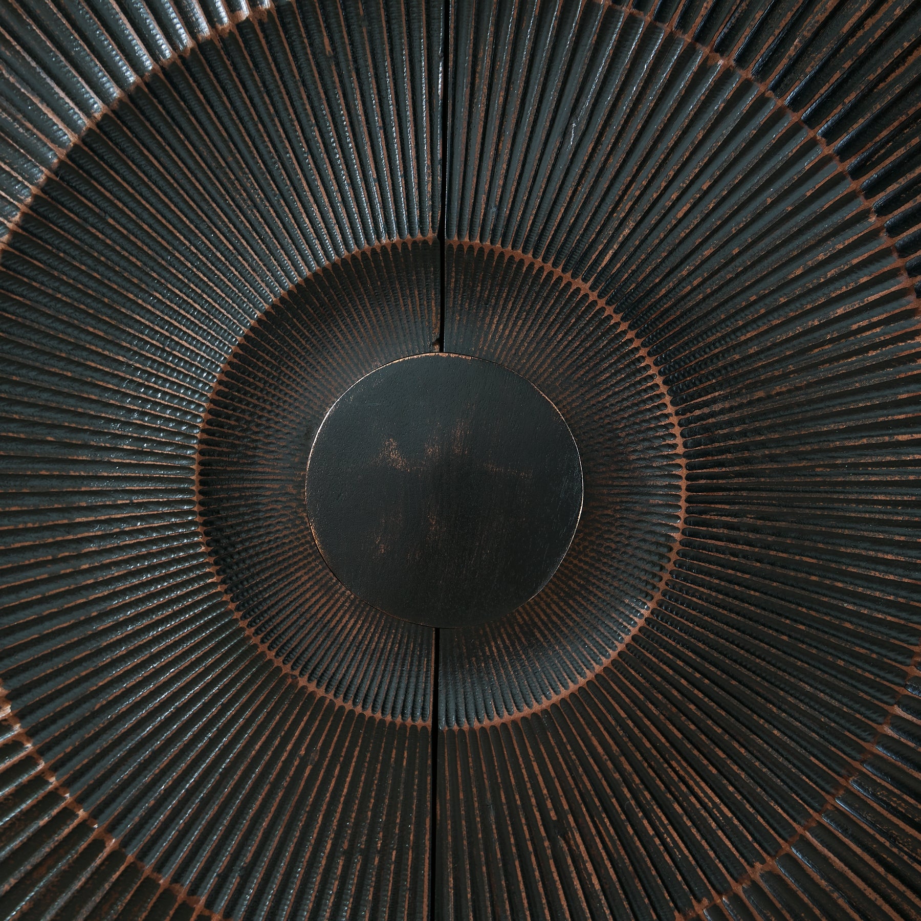 El estilo elegante está de moda con este armario con detalles de madera. Sus impresionantes puertas, adornadas con un patrón tallado en forma de rayos de sol y un tirador de madera de gran tamaño, se abren para revelar dos estantes. Un acabado negro desgastado agrega un estilo contemporáneo. Ya sea que este armario se adapte a las necesidades de almacenamiento o para ocultar el desorden, es realmente una pieza de exhibición.