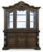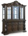 | Detalles | Incluye aparador y aparador, Fabricado con maderas duras macizas, chapas de roble y fresno en espiral con sustratos de MDF y componentes de resina fundida, Acabado marrón oscuro, Aparador con ventanas de vidrio biselado, interior de vidrio espejado, 2 estantes de vidrio transparente e iluminación de pantalla LED, Gabinetes tipo buffet cada uno con un solo estante ajustable y cajones terminados con revestimiento de fieltro, Requiere ensamblaje | |