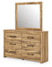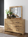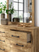 Approachable in character, this dresser and mirror embody fresh style that inspires. A warm finish and replicated oak grain invite with homey charm, while details like sleek drawer pulls lend a contemporary attitude. From urban chic to modern farmhouse, this versatile piece seamlessly reflects your eye for design.