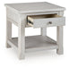 This end table is sure to impress with its timeless traditional vibe. Thanks to the antiqued white finish and wood grain texture, modern farmhouse design has never been so fashionable. The smooth-gliding drawer is ideal for stowing items out of sight, while the bottom shelf provides ample space for books or decor. This versatile piece makes it so easy to eat, work or play from the comfort of your sofa.