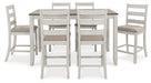 | Detalles | Incluye mesa de comedor de altura de mostrador y 6 taburetes de bar de altura de mostrador, Mesa hecha con maderas macizas, chapa de acacia y sustrato de MDF, Taburetes hechos con marcos de madera maciza, Acabado blanco grisáceo con efecto de frotado, Tablero de mesa con acabado en tono de madera marrón, Tapicería de poliéster, Asientos acolchados con espuma, Requiere ensamblaje | |