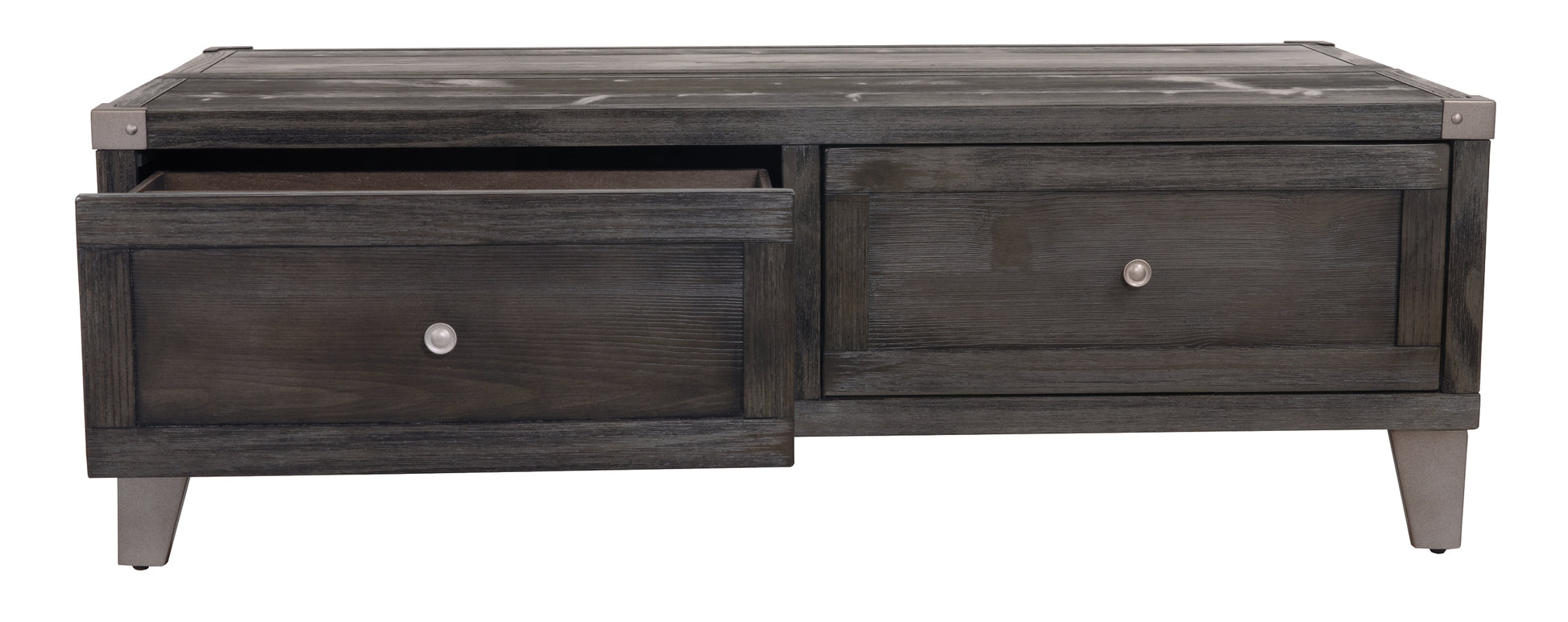 La mesa elevable de materiales mixtos realza verdaderamente el estilo rústico-industrial. La madera de pino desgastada por el clima y las chapas contrastan con las patas de metal inclinadas y los detalles de los soportes de las esquinas para lograr una fusión única y elegante de belleza natural y estilo contemporáneo. Un práctico mecanismo con resorte acerca la mesa a usted, mientras que dos cajones con bandejas de almacenamiento extraíbles están repletos de posibilidades.