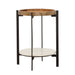 • Round end table crafted from mango wood, marble, and iron