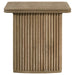 Grounded in architectural simplicity, this square end table showcases sculptural reeding and smooth curvature in a compact, functional form. The softly rounded square top rests over a dual curved pedestal base adorned with vertical reeded detailing, all finished in a warm distressed light brown. Crafted from engineered wood and ash veneer, this side table merges texture, rhythm, and utility as a refined accent for living rooms or bedrooms.